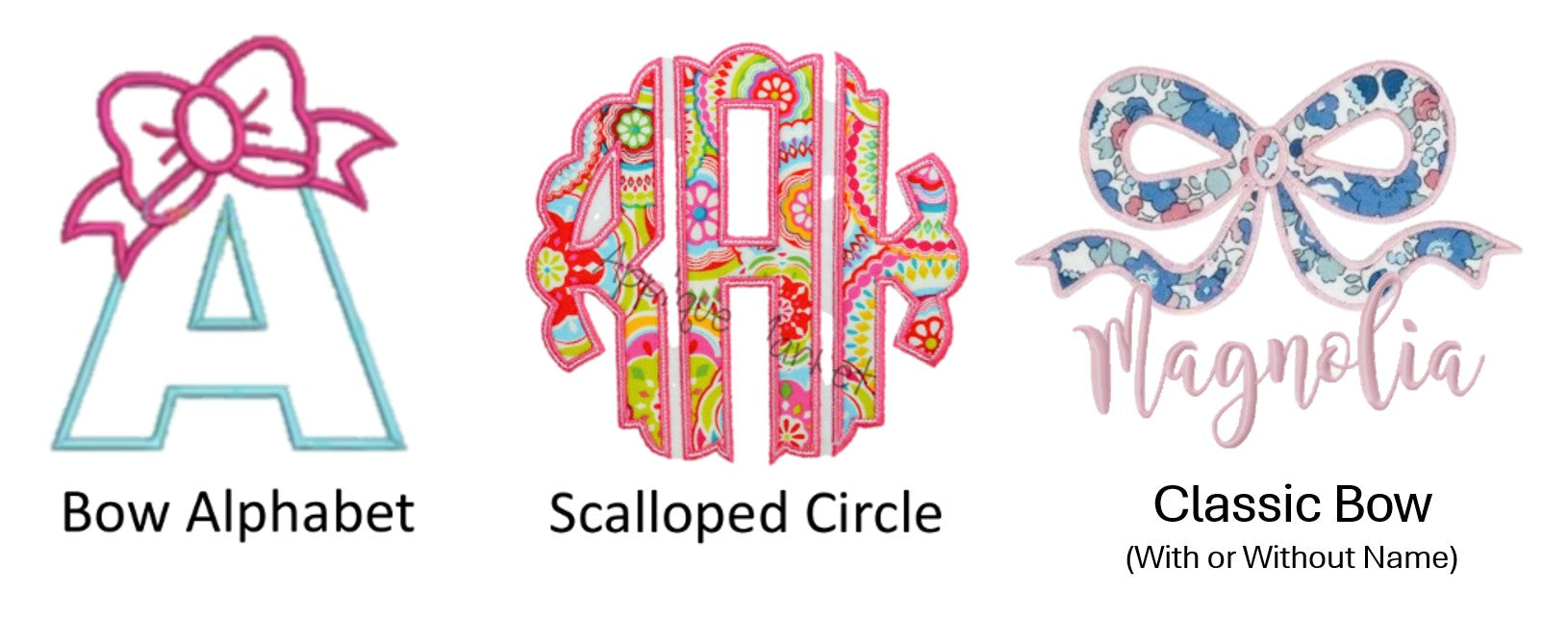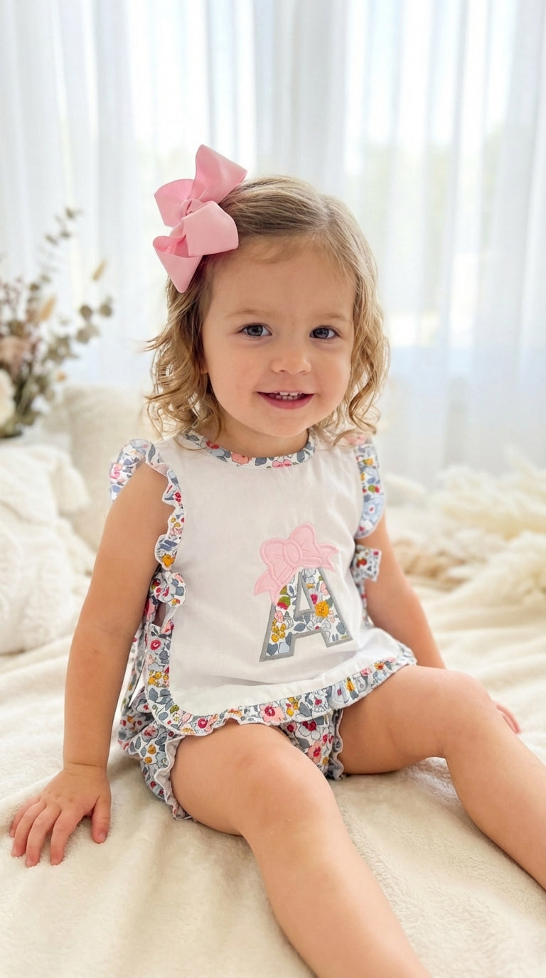*IMPORTANT - Embroidery is included in price for this item. Fabric for Applique will automatically match bloomers and trim unless requested otherwise. Threads will automatically match blue and pink in floral pattern (see sample pic) unless requested otherwise.